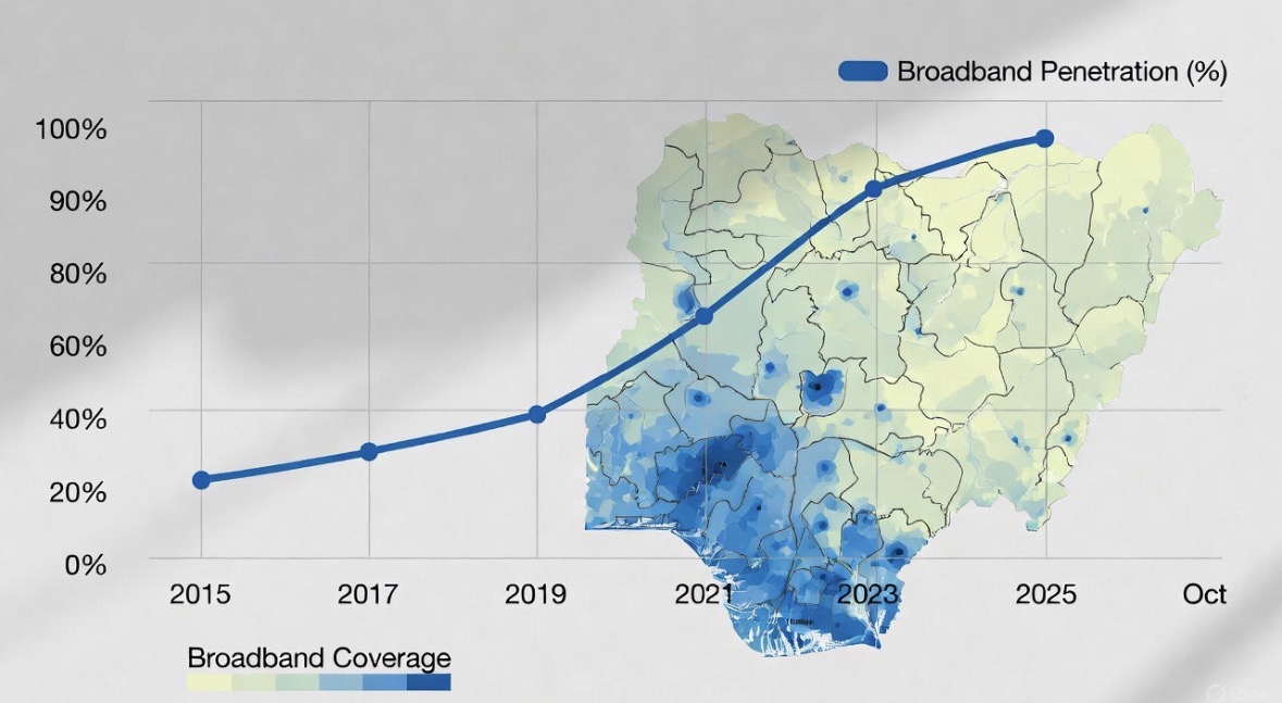 Nigeria broadband penetration reached 49.89 percent as of October 2025 according to the latest official data from the Nigerian Communications Commission (NCC). This figure marks the highest level recorded in 2025 and reflects gradual progress driven by mobile network growth. However the country missed the ambitious 70 percent target set in the National Broadband Plan (NBP) 2020–2025 which expired at the end of December 2025.